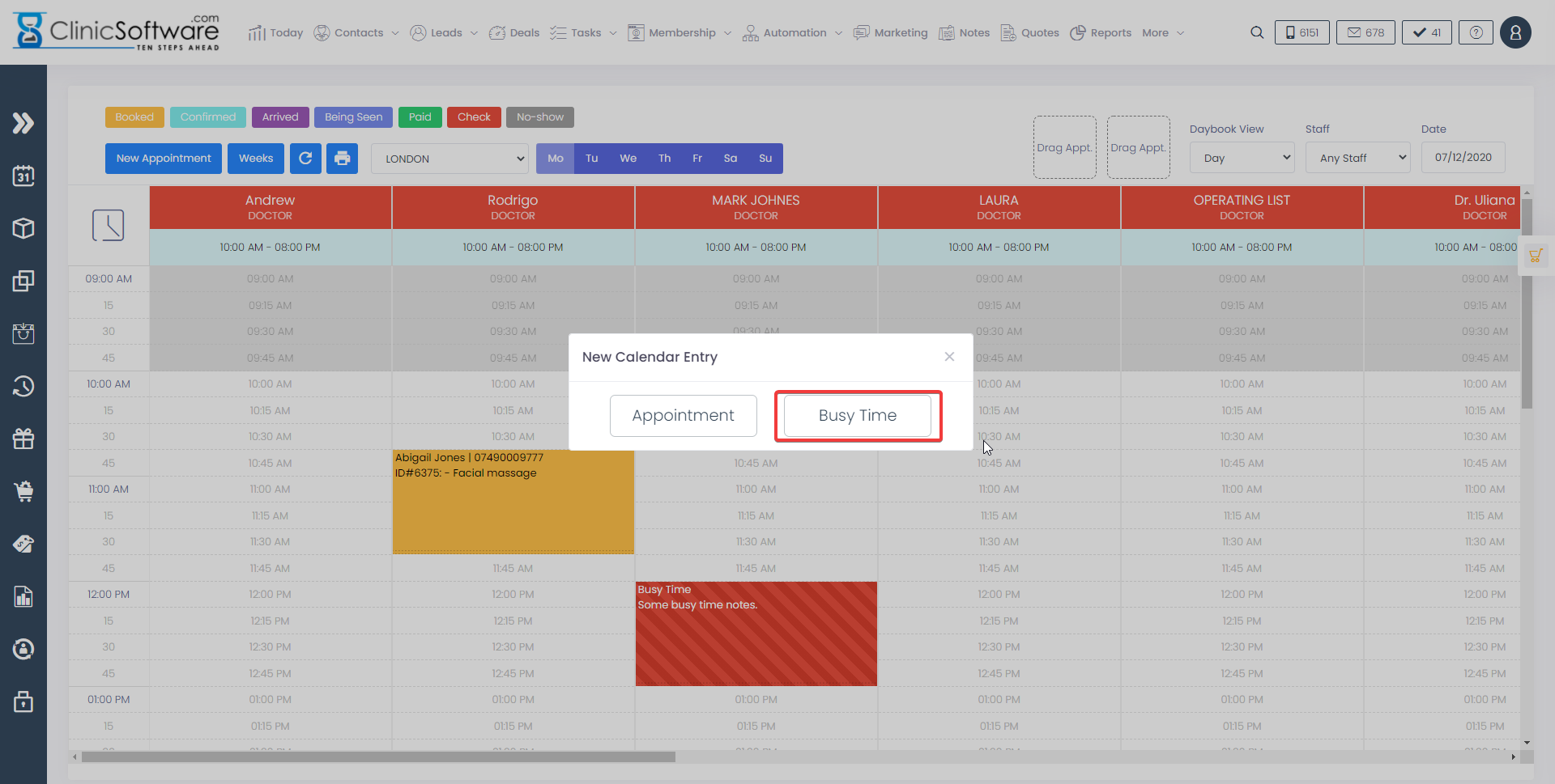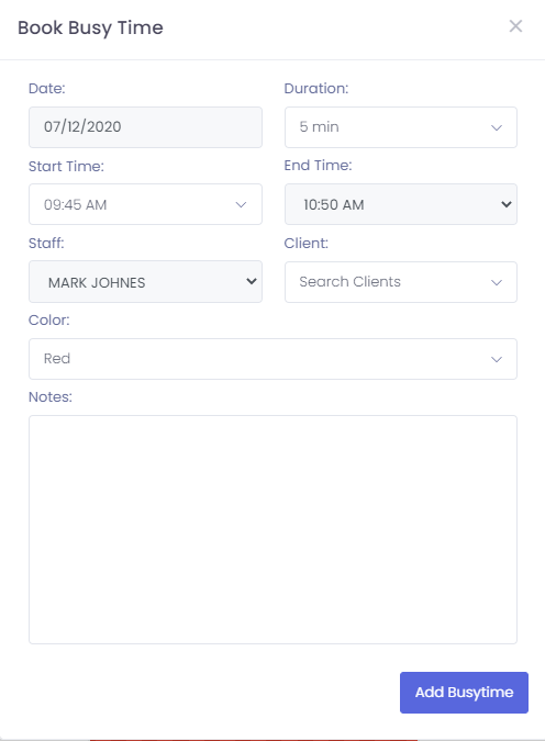 To edit the busy time entry make the necessary changes (date, time, duration, staff or notes) and then press the “UPDATE” button.